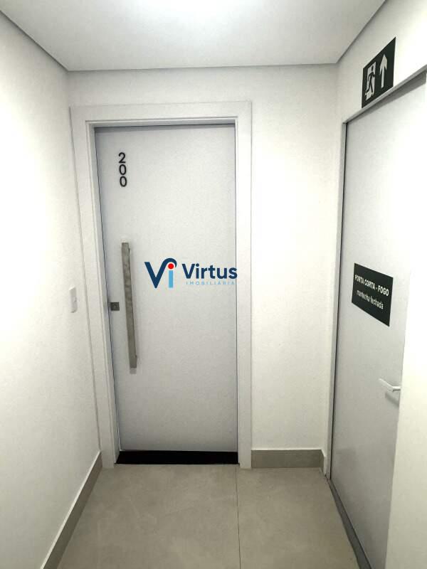 O apartamento tem uma sala em formato "L", com uma janela que vai até o chão, aumentando a luminosidade que entra no ambiente, e um lavabo, compondo o espaço comum do apartamento.