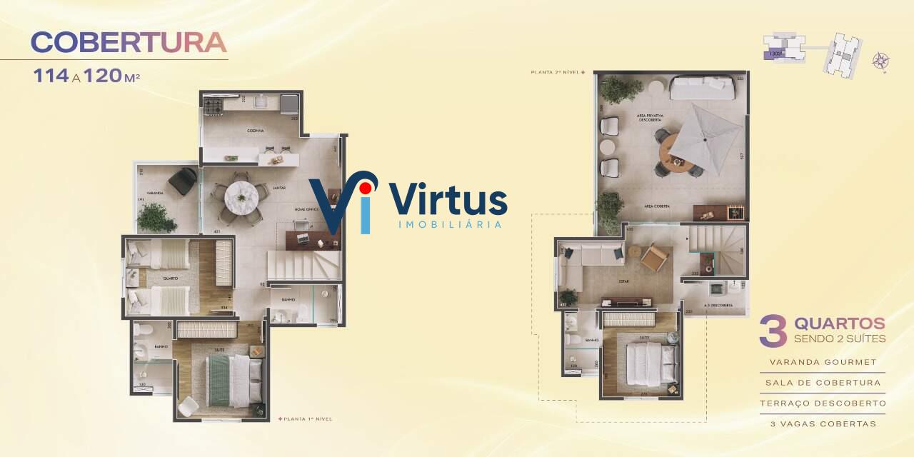 4 opções de cobertura por torre com 114 a 120 m2, sendo elas de 03 quartos;